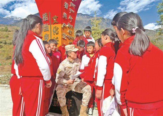 圖為部隊(duì)官兵為學(xué)生講述紅色故事。記者 王敏 攝 為深化民族團(tuán)結(jié)進(jìn)步教育,弘揚(yáng)愛(ài)國(guó)主義精神,11月28日,林芝市墨脫縣格當(dāng)鄉(xiāng)聯(lián)合駐藏部隊(duì)官兵、格當(dāng)鄉(xiāng)小學(xué)師生共計(jì)40余人,在鄉(xiāng)軍地共建文化長(zhǎng)廊開(kāi)展“民族團(tuán)結(jié)一家親 愛(ài)國(guó)情懷潤(rùn)人心”主題教育活動(dòng)?!?/a>