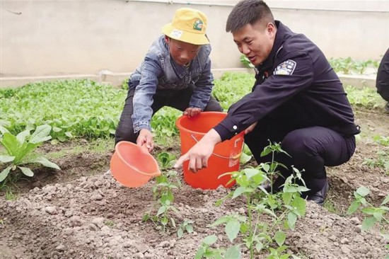 門士邊境派出所民警引導(dǎo)轄區(qū)學(xué)生澆肥。 圖由龍小風(fēng)提供