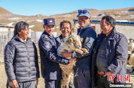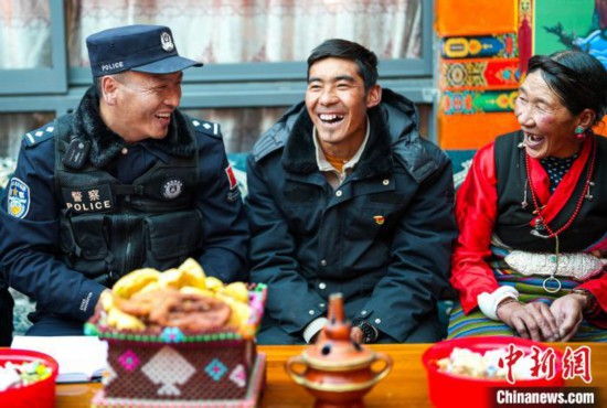 圖為崗巴邊境派出所民警嘎色與若木新村老百姓分享收獲的喜悅。葉軼 攝