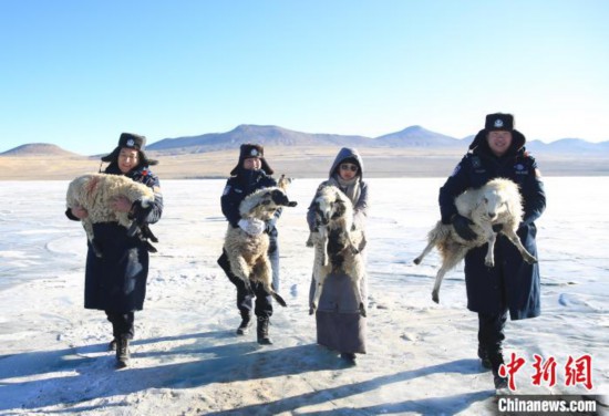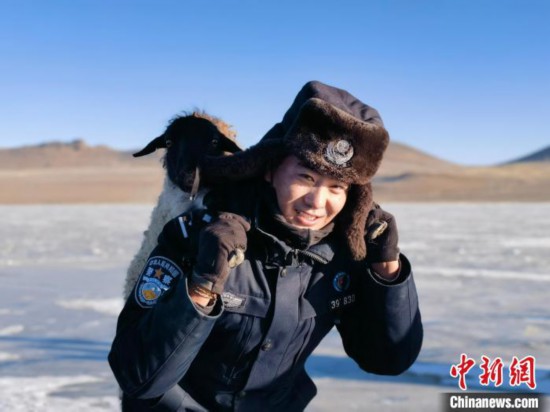 在光滑的冰面上,不時(shí)有小羊摔倒,甚至有“懶惰”的大羊直接“趴窩”不前,民警們不是將他們抱著就是扶著前行。在海拔5070米的冰面上負(fù)重前行,民警大口喘著粗氣,還時(shí)不時(shí)踩滑摔跤,但臉上始終洋溢著幸福的笑容。