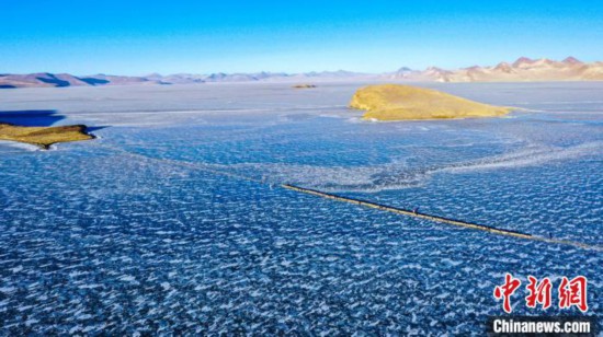 圖為西藏出入境邊防檢查總站浪卡子邊境管理大隊(duì)民警在冰面拋灑牛糞爐灰。彭維熙 攝