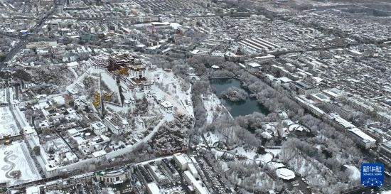 2023年12月8日,雪后的布達(dá)拉宮及其后的“宗角祿康”龍王潭公園(無(wú)人機(jī)照片)。新華社記者 洛卓嘉措 攝
