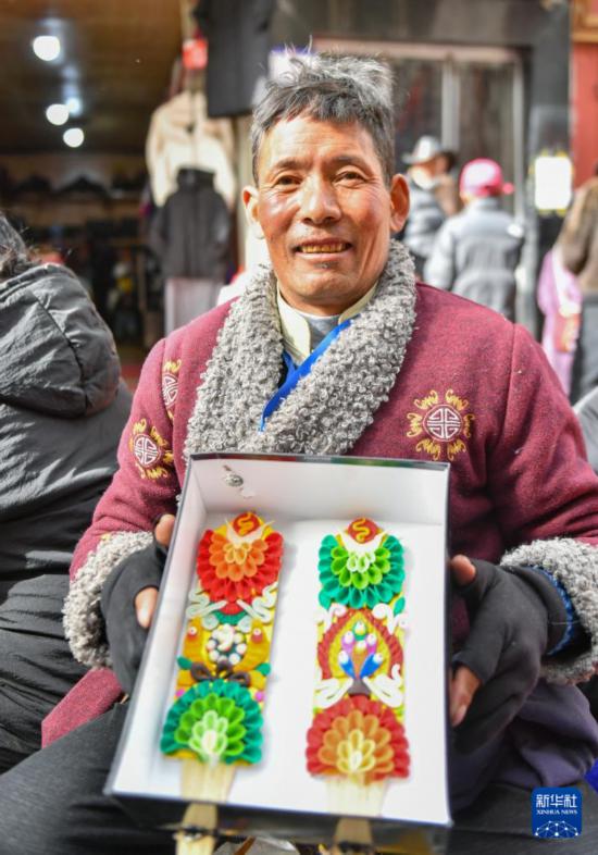 ??2月7日,在拉薩八廓商城,商販在展示售賣的酥油花。新華社記者 孫瑞博 攝
