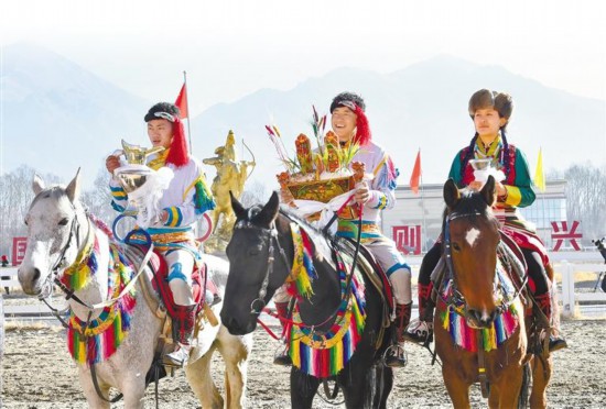 手捧潔白的哈達(dá)和鮮花,騎手們揚(yáng)鞭策馬走上賽場(chǎng),用策馬奔騰、賽場(chǎng)競(jìng)技和騎馬拾哈達(dá)、騎馬射箭等精彩表演,為觀眾送上新年的祝福。