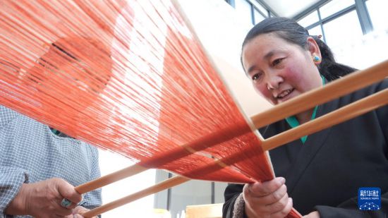 ??這是格桑卓瑪在幫助指導(dǎo)當(dāng)?shù)厝罕妼W(xué)習(xí)新織機(jī)用法。新華社記者 洛卓嘉措 攝