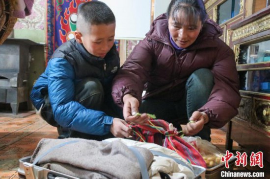 圖為格桑媽媽把糌粑等物品裝入格桑行李中。羅發(fā)燕 攝