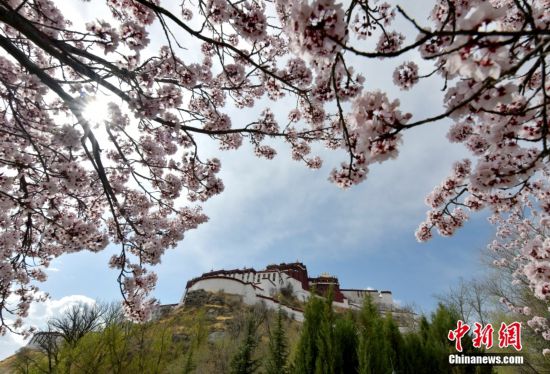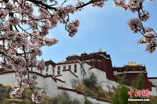 4月6日,西藏拉薩布達拉宮腳下春花綻放,與布達拉宮相互映襯。中新社記者 李林 攝