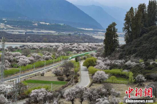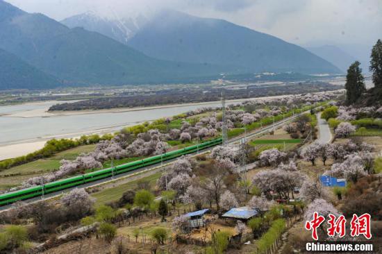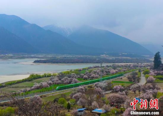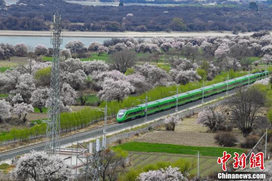圖為穿梭在桃花林中的拉林鐵路高原復(fù)興號。貢嘎來松 攝