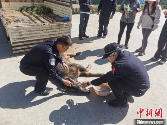 現(xiàn)場檢查發(fā)現(xiàn),“四不像”后腿受傷、身體虛弱,無法自行離開,巡邏民警隨即疏導交通,組織警力將其帶回派出所處理傷口、投喂水食,并及時移交米林市林草局進一步救治。