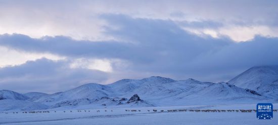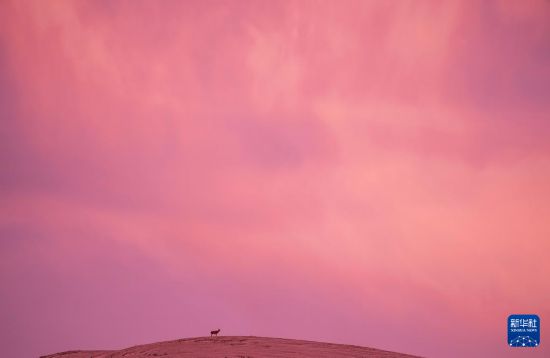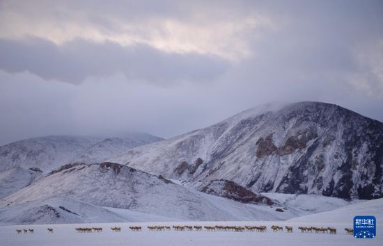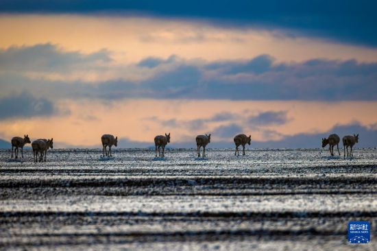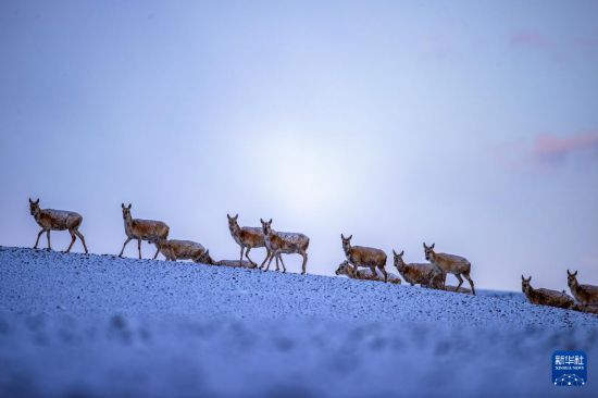 6月15日清晨雪后,在羌塘國家級自然保護區(qū),迎著朝霞前行在遷徙路上的一群藏羚羊。新華社記者 費茂華 攝
