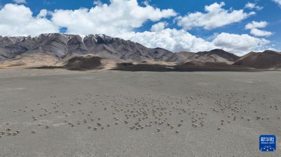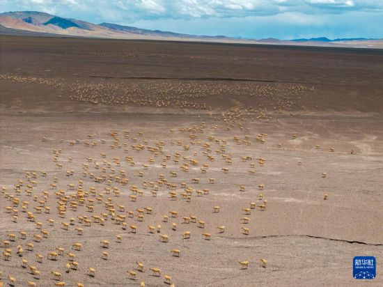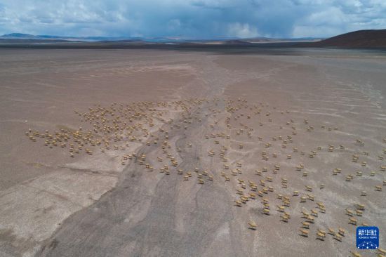 遷徙途中的藏羚羊(6月13日攝,無人機照片)。新華社記者 旦增尼瑪曲珠 攝
