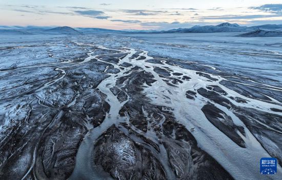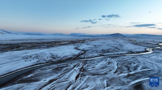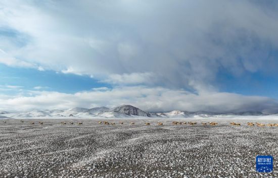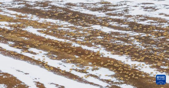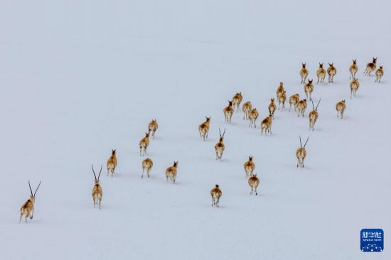在甜水河畔荒灘雪地中向產(chǎn)羔地遷徙的藏羚羊(6月15日攝,無人機照片)。新華社記者 晉美多吉 攝