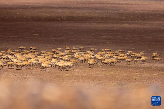 大群遷徙的藏羚羊在甜水河畔的荒灘上向產(chǎn)羔地遷徙(6月14日攝)。新華社記者 姜帆 攝