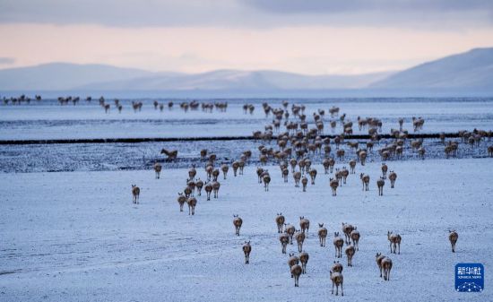 落日余暉中大群遷徙的藏羚羊行進在甜水河畔的荒灘上(6月13日攝)。新華社記者 姜帆 攝