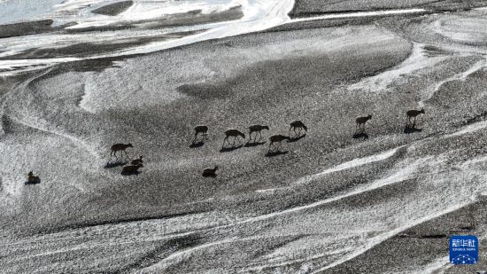 這是在甜水河畔荒灘雪地中向產(chǎn)羔地遷徙的藏羚羊(6月15日攝,無人機照片)。新華社記者 晉美多吉 攝