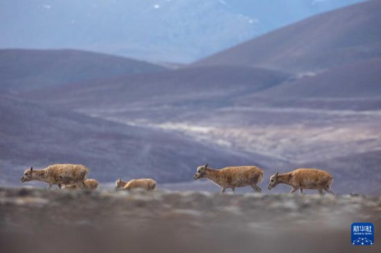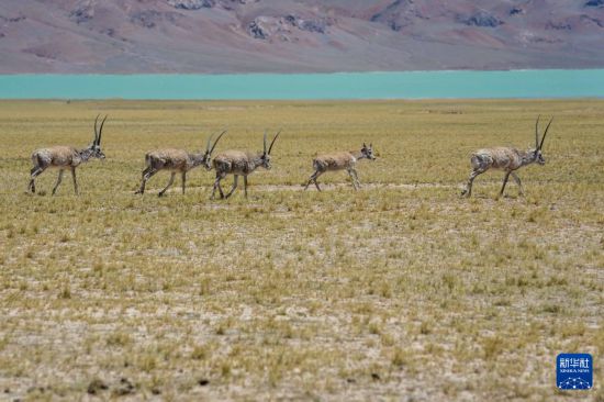 幾只公藏羚羊守護母藏羚羊前進(5月8日攝)。新華社記者 姜帆 攝