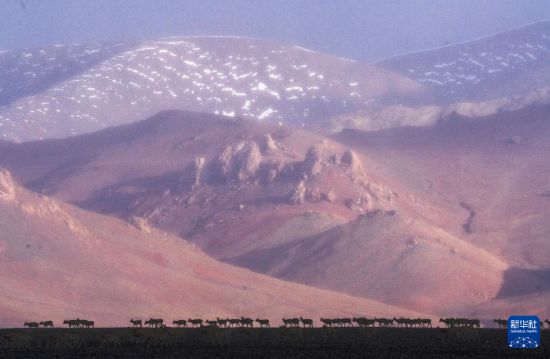 一群藏野驢在雪地中注視著遷徙的藏羚羊(5月8日攝)。新華社記者 姜帆 攝