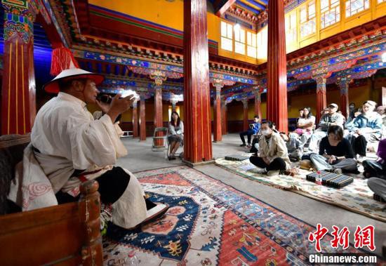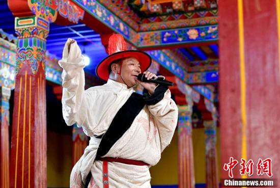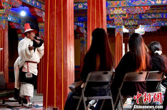 “昌魯”意為“俠盜歌”或“游俠歌”,是藏北民歌的基本體裁之一,歌詞多為即興創(chuàng)作,歷史悠久,流傳廣泛。圖為8月17日,國家級非物質文化遺產“昌魯”的自治區(qū)級代表性傳承人次仁多吉在古建大院喜德林為觀眾帶來獨特的“聲”之體驗。中新社記者 李林 攝