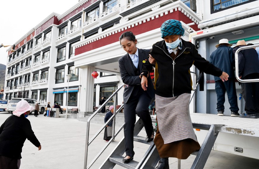 圖為山南市乃東區(qū)集中供養(yǎng)中心老人正在金融服務(wù)流動(dòng)車(chē)辦理業(yè)務(wù)。人民網(wǎng)記者 次仁羅布攝