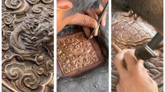 所謂錘揲法,是以銅片或金銀板片為原料,使用鐵臂、鐵套、榔頭、鏨子等工具,敲打出浮雕紋樣、各類造像、建筑裝飾等,對(duì)工匠造型能力與經(jīng)驗(yàn)要求很高。