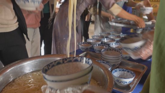游客的手機(jī)、相機(jī)鏡頭嚴(yán)陣以待,小碗橫排豎列擺滿一桌,七八位廚娘麻利撈面,最終在每個(gè)碗中盛下三五根面、一口湯。