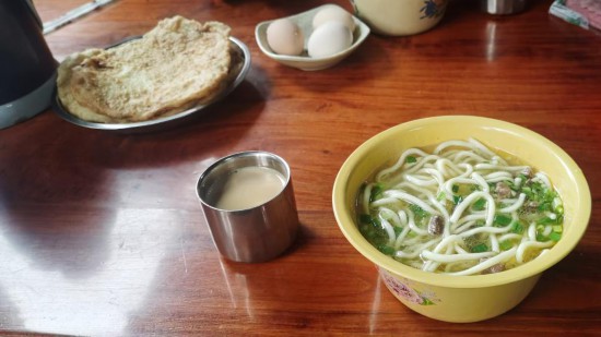 藏面的經(jīng)典套餐中還包括牛肉油餅、雞蛋和甜茶。新華社記者魏冠宇 攝