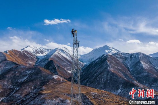 圖為2023年11月30日,西藏昌都電力施工人員在一條35千伏線路上開展塔上作業(yè),其身后為茫茫雪山。趙清鵬 攝