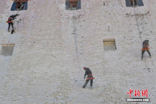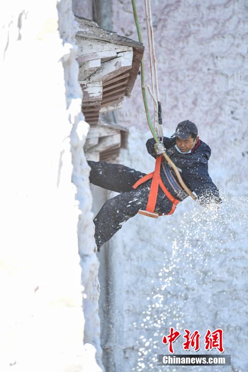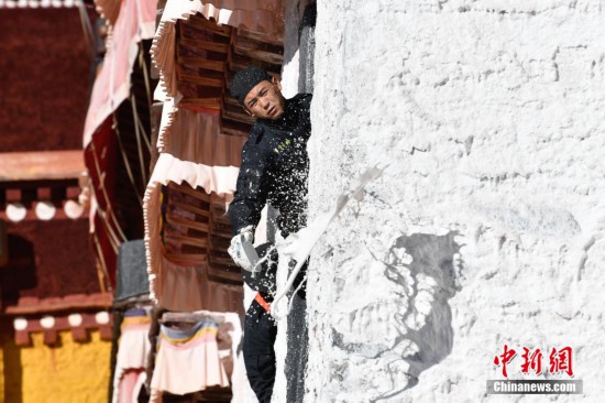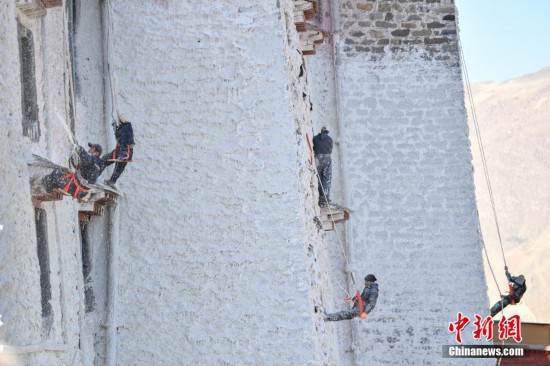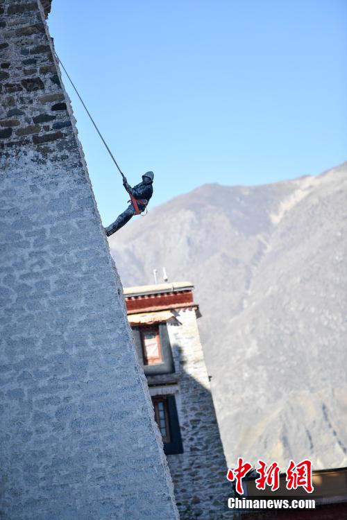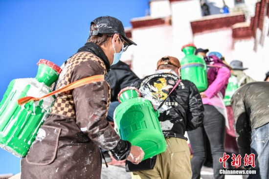 10月28日,西藏拉薩,世界文化遺產(chǎn)布達拉宮迎來了一年一度的粉刷季。當日,布達拉宮管理處的工作人員和拉薩信眾自發(fā)參與其中對宮墻、窗框進行整體粉刷,為布達拉宮“年度美容”。圖為工作人員對布達拉宮外墻噴灑涂料。中新社記者 貢嘎來松 攝