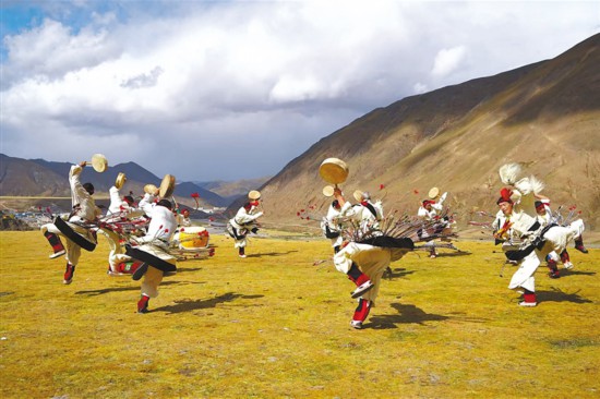 圖為舞者在草原上表演索縣“雪熱巴”。記者 曲珍 通訊員 益西卓瑪 攝