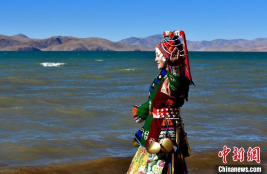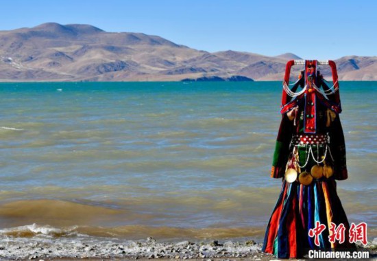 圖為12月7日,當?shù)孛癖娫谏暝h格仁錯湖畔展示巴扎服飾。中新社記者 李林 攝