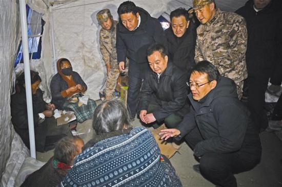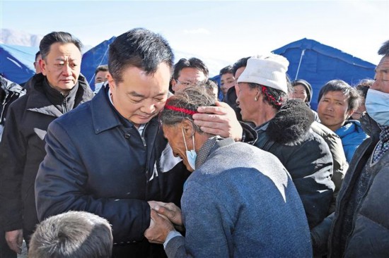 每到一處,王君正都向群眾轉(zhuǎn)達(dá)習(xí)近平總書記和黨中央、中央領(lǐng)導(dǎo)同志的關(guān)心關(guān)懷,告訴群眾相信有習(xí)近平總書記的關(guān)心關(guān)懷,我們就沒有克服不了的困難。當(dāng)受災(zāi)群眾聽到習(xí)近平總書記和中央領(lǐng)導(dǎo)同志的關(guān)心關(guān)懷,大家十分激動,許多群眾流下了感動的淚水,對抗震救災(zāi)、重建家園燃起了信心?!拔覀兙褪菗?dān)心老人孩子晚上受凍感冒。”當(dāng)聽到災(zāi)區(qū)群眾的擔(dān)心時,王君正說:“你們的擔(dān)心正是我們的擔(dān)心?!碧鞛?zāi)無情、人有情。在安置點(diǎn)上,王君正鼓勵受災(zāi)群眾堅(jiān)定信心,黨和政府一定會全力以赴開展抗震救災(zāi),大家要團(tuán)結(jié)一心、互幫互助,克服暫時的困難,加強(qiáng)統(tǒng)一規(guī)劃、重建新家園,齊心協(xié)力共建社會主義新農(nóng)村。晚上六點(diǎn)三十分許,海拔4400米的安置點(diǎn)上寒風(fēng)凜冽,看見已有帳篷陸陸續(xù)續(xù)搭建起來,王君正叮囑受災(zāi)群眾趕緊到帳篷里取暖,不要受涼受凍。他要求相關(guān)部門,要深刻認(rèn)識災(zāi)區(qū)地處高海拔區(qū)域的特殊情況,把受災(zāi)群眾御寒保暖工作擺在更加突出位置,加緊調(diào)集棉帳篷、棉衣、棉被、烤火爐等物資,加快帳篷安裝進(jìn)度,確保受災(zāi)群眾吃上熱飯、喝上熱水、住上帳篷、溫暖過夜、感受親情。要嚴(yán)防發(fā)生次生災(zāi)害,全面排查房屋受損情況,對嚴(yán)重受損的建筑嚴(yán)格管控,強(qiáng)化巡查值守,做好安全防范工作,嚴(yán)防火災(zāi),抓好衛(wèi)生防疫,配備預(yù)防流感等藥物,加強(qiáng)食品和飲用水衛(wèi)生監(jiān)管,堅(jiān)決維護(hù)災(zāi)區(qū)社會穩(wěn)定。要充分發(fā)揮基層黨組織戰(zhàn)斗堡壘作用和黨員先鋒模范作用,落實(shí)落細(xì)黨中央和自治區(qū)抗震救災(zāi)各項(xiàng)安排部署,主動同受災(zāi)群眾吃住在一起,用心用情解決困難,引導(dǎo)受災(zāi)群眾開展自救、互幫互助,讓黨旗在抗震救災(zāi)一線高高飄揚(yáng)。黨政軍警民要協(xié)調(diào)聯(lián)動,解放軍、武警、消防、邊檢和地方各救援力量要統(tǒng)一指揮、統(tǒng)一調(diào)度、加強(qiáng)協(xié)同、密切合作,齊心協(xié)力抓好抗震救災(zāi)工作。