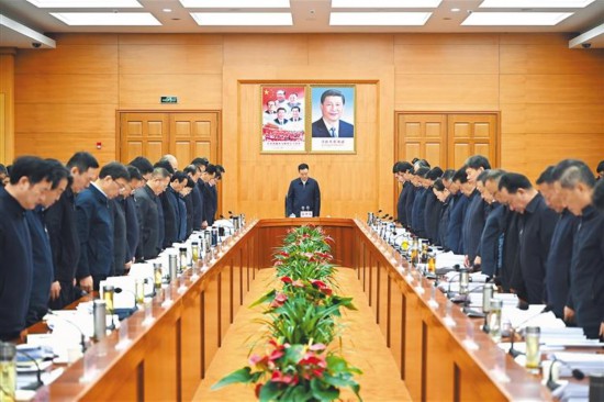 自治區(qū)黨委5樓會議室氣氛莊嚴肅穆,王君正等神情凝重,默然肅立。他說,1月7日,日喀則市定日縣發(fā)生6.8級地震,給人民群眾生命財產(chǎn)造成重大損失,我提議全體起立向地震中不幸遇難的同胞默哀。9時32分,隨著一句“請全體肅立,集體默哀3分鐘”,王君正等靜立垂首、十分悲痛。3分鐘,180秒,寄托深切哀思;3分鐘,180秒,是對每一個生命的敬重和珍視;3分鐘,180秒,彰顯生命重于泰山,人民高于一切!