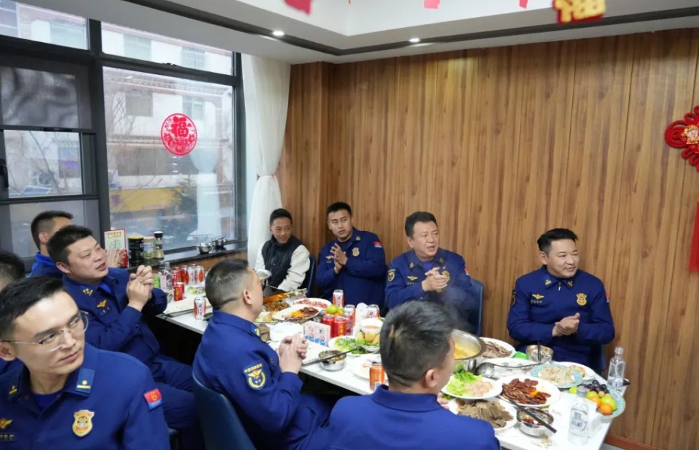 除夕夜,支隊(duì)機(jī)關(guān)與各基層單位同步開展“吃團(tuán)年飯”活動(dòng)。支隊(duì)黨委書記、政治委員達(dá)娃平措代表支隊(duì)黨委,向全體人員致以親切的新年祝福,并向來(lái)隊(duì)家屬獻(xiàn)上鮮花,表達(dá)誠(chéng)摯的感謝。全體指戰(zhàn)員、政府專職隊(duì)員、消防文員、事業(yè)編制人員及家屬齊聚一堂,在充滿“年味”的會(huì)餐中,大家以飲料代酒,“推杯換盞”,互道新春祝福。期間,指戰(zhàn)員們紛紛展示才藝,載歌載舞,現(xiàn)場(chǎng)氣氛喜慶熱烈,溫馨祥和。