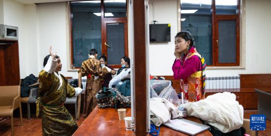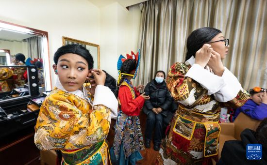 小演員在準(zhǔn)備演出舞臺(tái)劇藏戲《頓月頓珠》(2月11日攝)。新華社記者 丁增尼達(dá) 攝