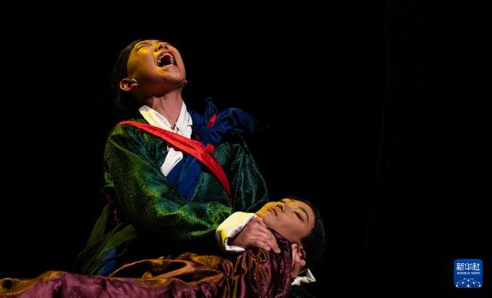 西藏首部少兒舞臺(tái)劇藏戲《頓月頓珠》演出現(xiàn)場(chǎng);羅桑朗覺(jué)(右)飾演“頓月”,旦增夢(mèng)朗(左)飾演“頓珠”(2月11日攝)。新華社記者 丁增尼達(dá) 攝