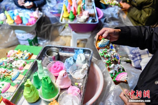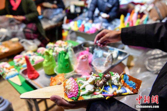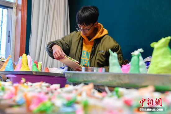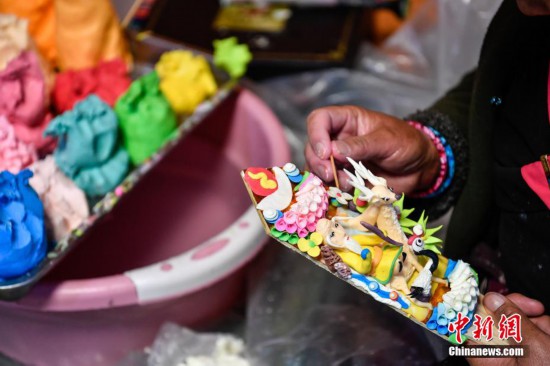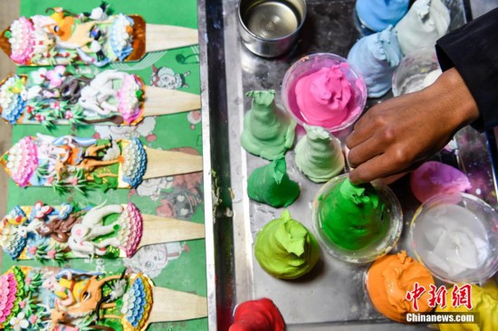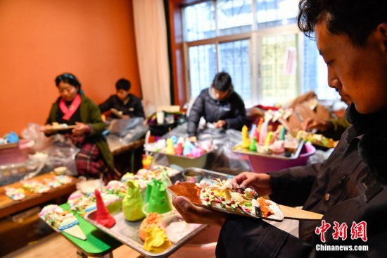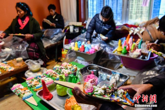 2月15日,手工藝人在拉薩制作酥油花。隨著藏歷新年臨近,酥油花在拉薩年貨市場(chǎng)上熱銷。酥油花在藏語中稱為“孜扎”,是藏族民眾家庭中必備的年貨之一。中新社記者 貢嘎來松 攝