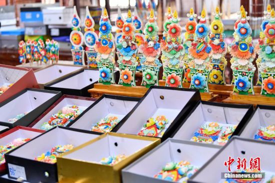 2月15日,手工藝人制作好的酥油花在拉薩八廓商場(chǎng)出售。隨著藏歷新年臨近,酥油花在拉薩年貨市場(chǎng)上熱銷。酥油花在藏語中稱為“孜扎”,是藏族民眾家庭中必備的年貨之一。