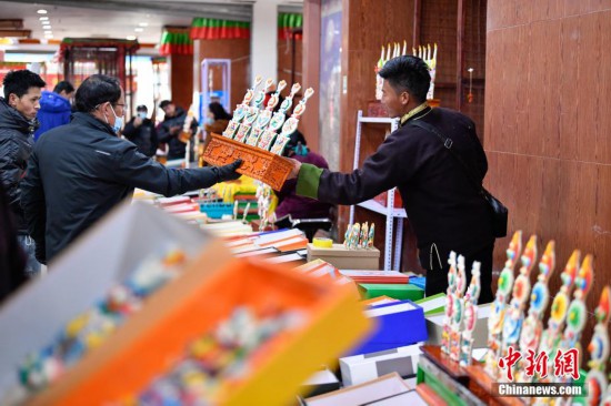 2月15日,拉薩市民在八廓商城選購年貨酥油花。隨著藏歷新年臨近,酥油花在拉薩年貨市場(chǎng)上熱銷。酥油花在藏語中稱為“孜扎”,是藏族民眾家庭中必備的年貨之一。