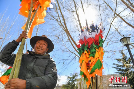 臨近藏歷新年,2月16日,在西藏拉薩街頭,農(nóng)牧民正縫制五彩經(jīng)幡樹。五彩經(jīng)幡樹是藏族民眾在藏歷新年前必備的年貨之一。藏歷新年期間,藏族民眾會選擇一個良辰吉日,為自家的房頂更換五彩經(jīng)幡樹,祈求新的一年里五谷豐登,吉祥如意。圖為2月16日,來自尼木縣的普瓊扛著五彩經(jīng)幡樹。貢確 攝