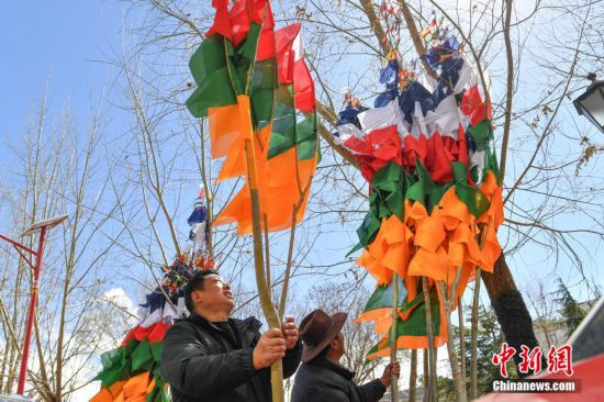 臨近藏歷新年,2月16日,在西藏拉薩街頭,農(nóng)牧民正縫制五彩經(jīng)幡樹。五彩經(jīng)幡樹是藏族民眾在藏歷新年前必備的年貨之一。藏歷新年期間,藏族民眾會選擇一個良辰吉日,為自家的房頂更換五彩經(jīng)幡樹,祈求新的一年里五谷豐登,吉祥如意。圖為2月16日,頓珠扛著五彩經(jīng)幡樹。貢確 攝