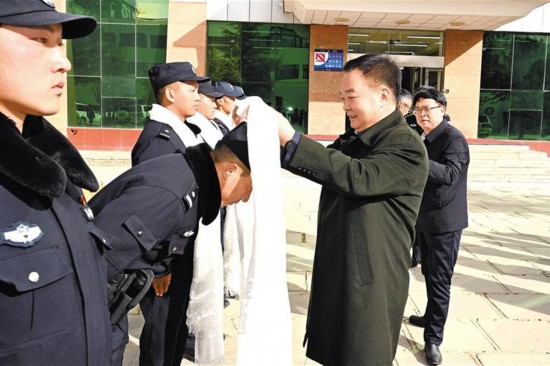 藏歷新年到來(lái)之際,自治區(qū)黨委書(shū)記王君正深入基層看望慰問(wèn)干部群眾和一線建設(shè)者。這是王君正在山南市乃東區(qū)公安局看望慰問(wèn)一線公安干警。 記者 旦增西旦 攝