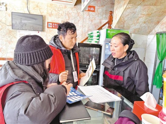 拉薩市城關(guān)區(qū)八一街道當(dāng)熱社區(qū)組織開展食品安全隱患排查工作。這是工作人員在仔細(xì)檢查商戶營業(yè)執(zhí)照、食品衛(wèi)生許可證和健康證等持證情況。 記者 王敏 攝