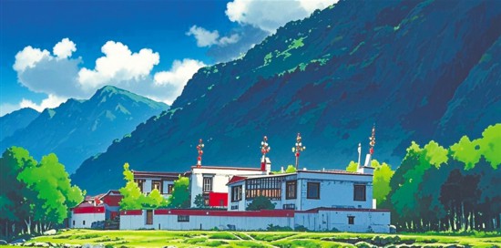 “我就是想以動(dòng)畫風(fēng)格給大家展示不一樣的堆龍?!钡┰隼氛f。只見她又將照片導(dǎo)入AI圖片生成軟件內(nèi),AI自動(dòng)識(shí)別圖像元素——經(jīng)幡的布料特性、水流的物理參數(shù)、建筑材質(zhì)的反光數(shù)據(jù)。輕點(diǎn)“生成”按鈕,1分23秒后,一張動(dòng)畫風(fēng)格的Shadada CoffeeX新型公共文化空間的圖片便呈現(xiàn)在眼前。重點(diǎn)不是技術(shù),是審美把關(guān),旦增拉姆指著屏幕上的失敗案例:“AI把青稞田處理成糖果色卡通,把圖書館渲染成賽博朋克風(fēng)格。我每天要調(diào)整無數(shù)次參數(shù),就像教AI理解什么是藏地美學(xué)。”她用最現(xiàn)代化的數(shù)字工具,“描繪”著堆龍德慶區(qū)新的光影詩篇。