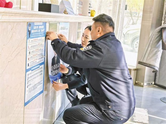 山南檢察司法警察協(xié)助檢察官張貼清理校園周邊環(huán)境的宣傳畫。