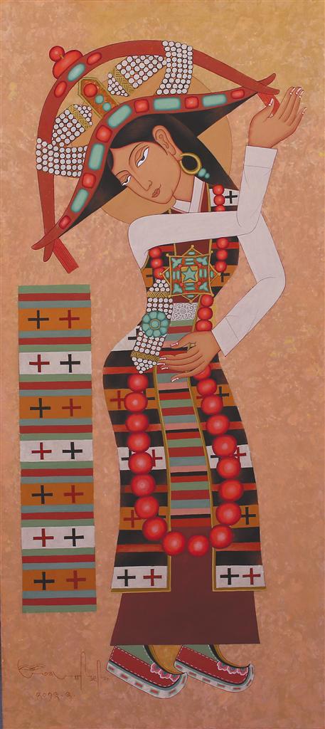 在昂桑“傳統(tǒng)當隨時代”的藝術理念浸潤下,徒弟們總能在傳統(tǒng)與當代的碰撞中找到獨特的表達坐標:來自日喀則的藝術家多吉次旺,早年被昂桑畫作中藏文元素與抽象色塊的融合所震撼。如今在拉薩創(chuàng)辦工作室的他,正將藏文書法的中鋒筆觸解構為流動的視覺符號——烏金體的頓挫韻律幻化為色彩的潮涌,在畫布上重現(xiàn)古老史詩的“當代心跳”;而主演《文成公主》實景劇的馮佳,這位四川傳媒大學表演系的畢業(yè)生,跟隨昂桑學畫四年,已能在《文成公主》系列中將唐卡礦物顏料的莊重與波普藝術的色塊切割并置,讓歷史人物既保有壁畫般的莊重感,又流淌著屬于時代的視覺節(jié)奏。