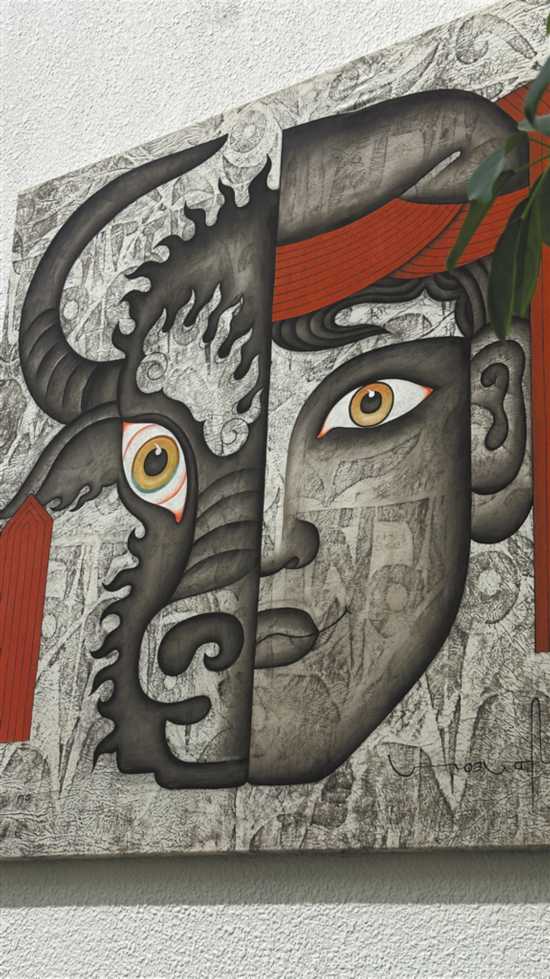 昂桑新作《十二生肖》中,藏式生肖圖騰與賽博朋克齒輪咬合,唐卡“三白法”渲染機械金屬光澤?!坝腥苏f我在解構傳統(tǒng),實則在編織文化‘經緯線’?!彼钢嫴颊f,“傳統(tǒng)不是凝固的酥油花,而是奔涌的河,接納現(xiàn)代支流,卻不忘雪山來處?!?/p>