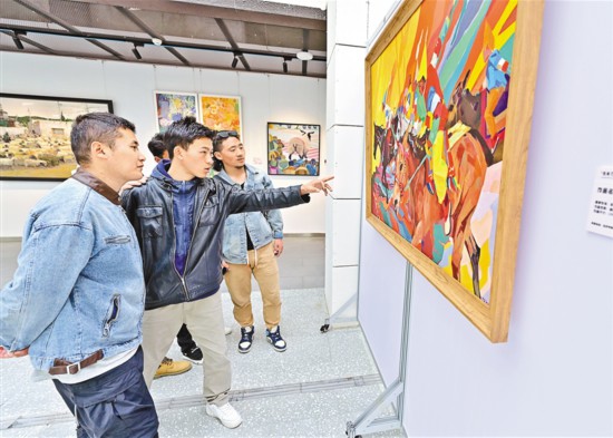 拉薩市首屆當(dāng)代女畫家美術(shù)聯(lián)展在西藏非遺博物館開幕,市民群眾正在觀展。