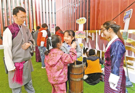 小朋友們在西藏牦牛博物館體驗(yàn)打酥油茶。