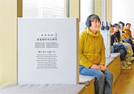市民游客在西藏博物館內(nèi)戴上耳機(jī)欣賞西藏傳統(tǒng)兒歌。