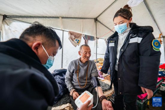 在那曲市索縣西昌鄉(xiāng),衛(wèi)生院醫(yī)務(wù)人員為蟲草采集點的牧民測量血壓(5月18日攝)。新華社記者 丁增尼達 攝